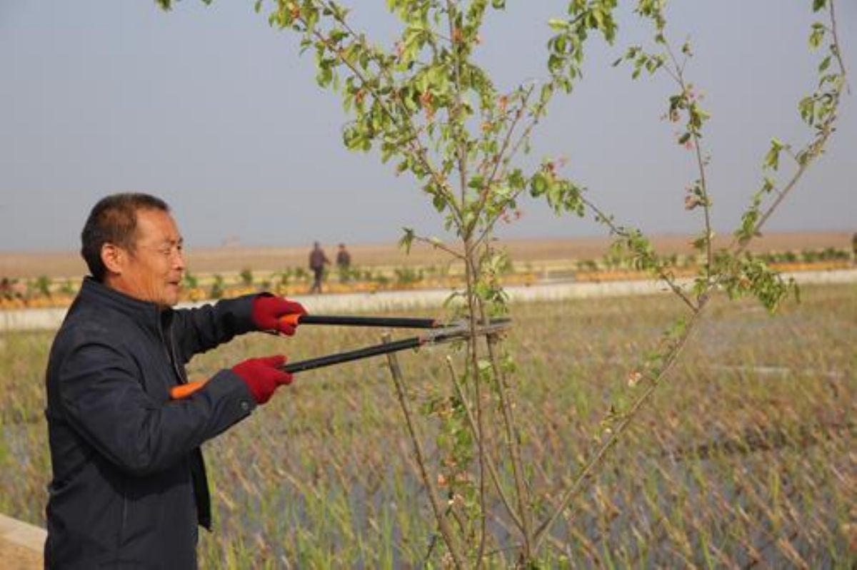 ▲永济伍姓湖湿地公园内,工人师傅正忙着修剪垂丝海棠树木。 薛启涛 摄
