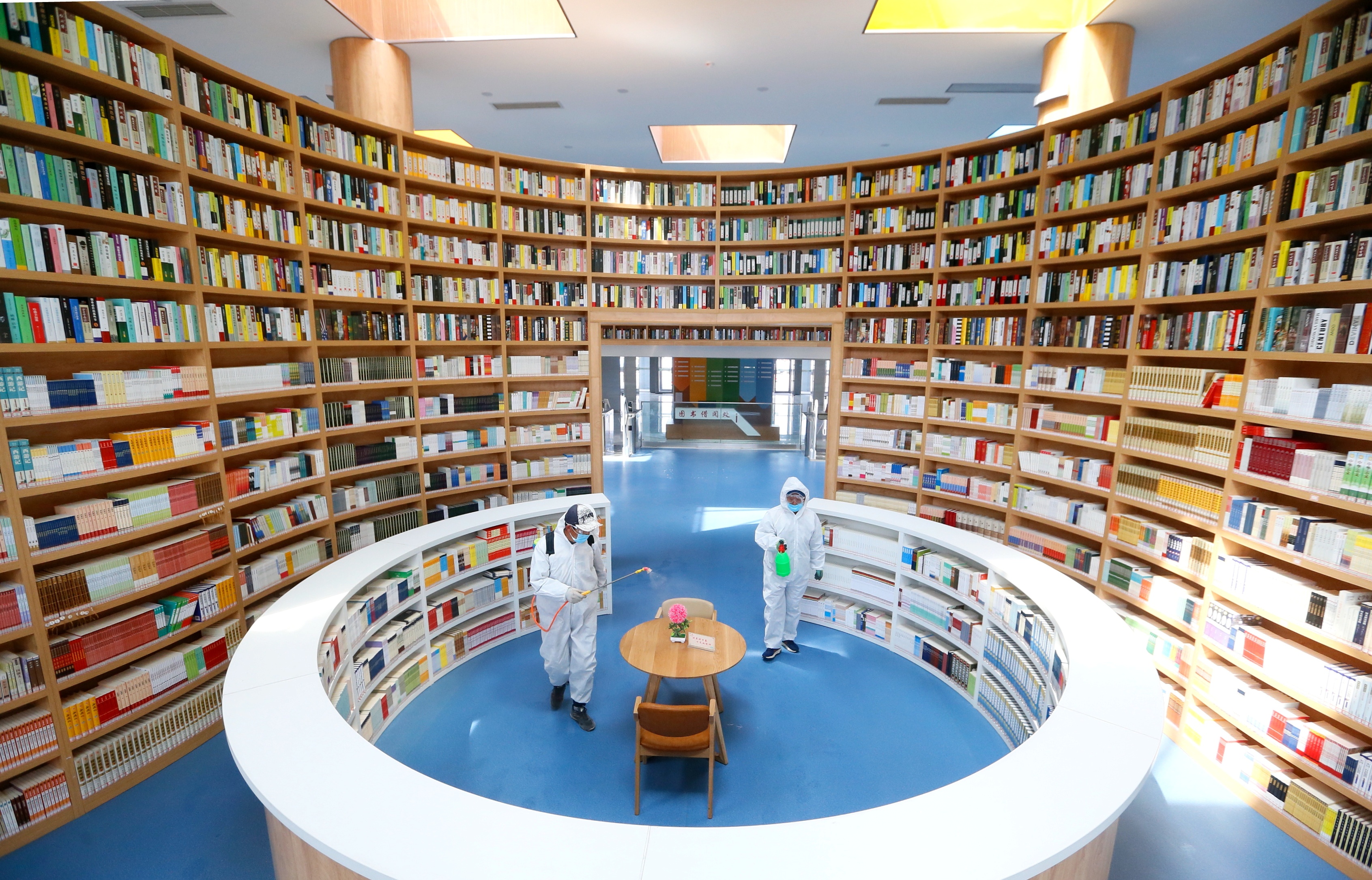 4月14日,山东省青岛通济实验学校的工作人员在对校园图书馆进行消毒。