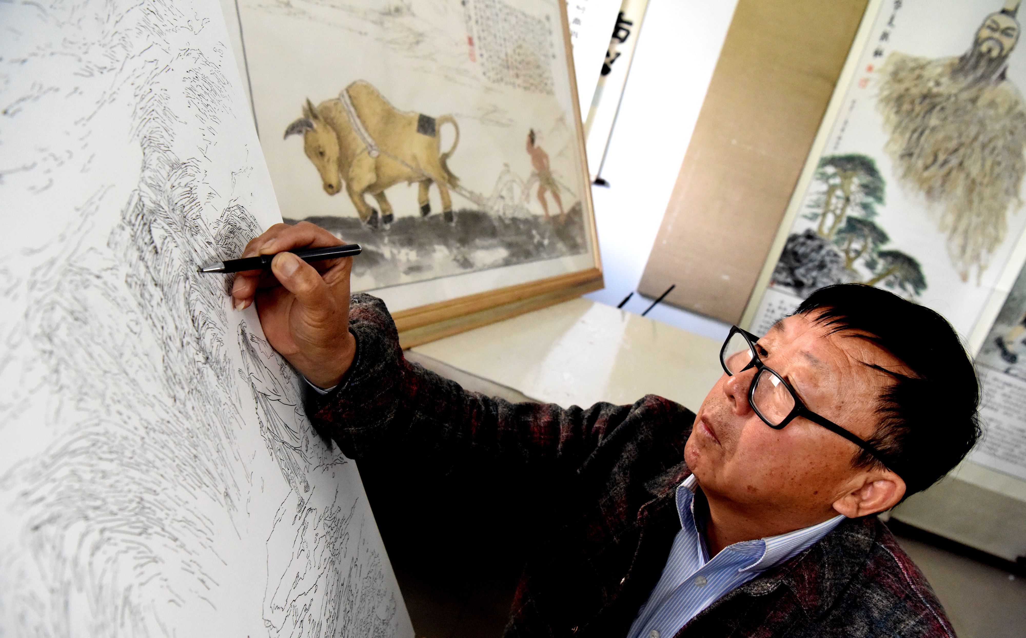 4月15日,垣曲县美术家协会主席、县舜文化研究会副会长刘拴安在创作舜文化绘画作品。