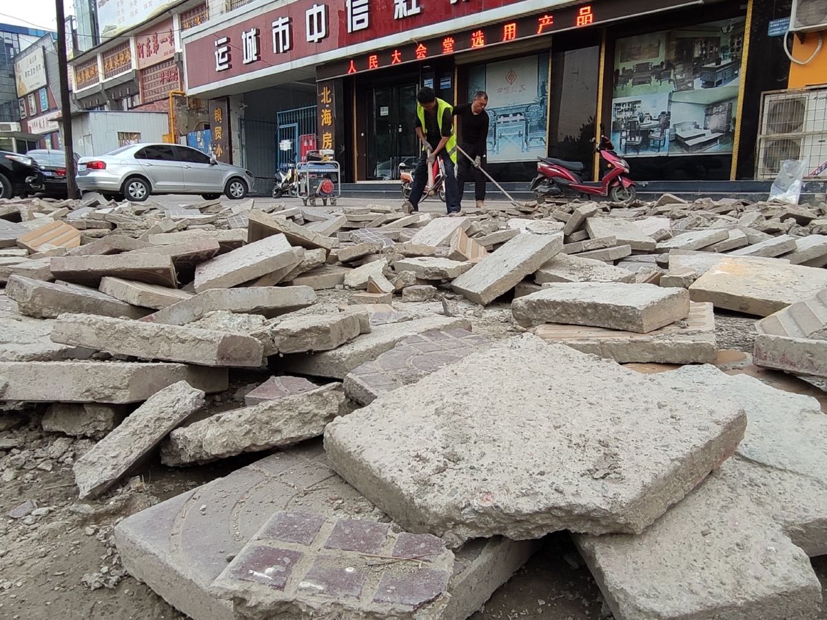 运城晚报讯(记者 祁克宁)4月14日下午,在市区禹都大道华联超市附近,市城市管理局市政设施维护队工人正抓紧修复人行道。