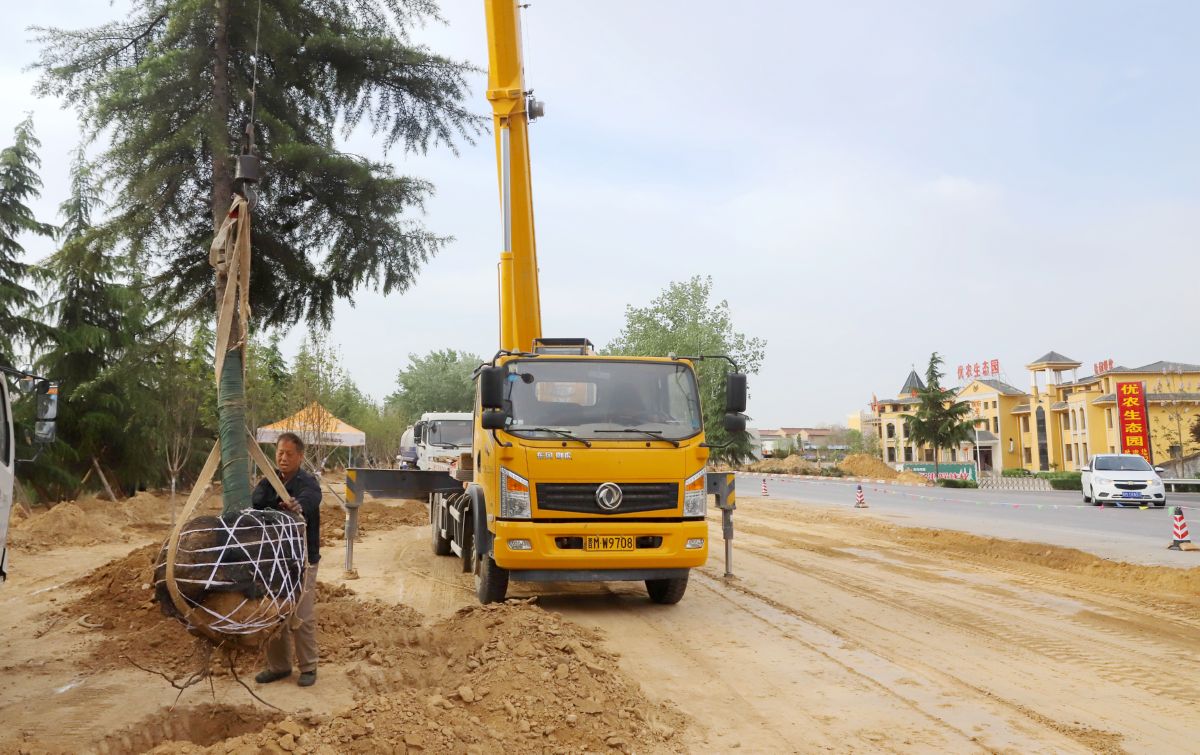 运城晚报讯 4月16日,工人们在夏县水头高速路口二级公路拓宽绿化和转盘公园绿化工程中紧张施工(右图)。