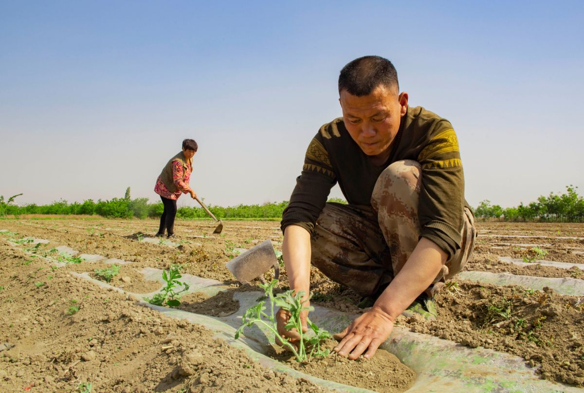 谷雨将至,盐湖区的农民朋友们抓住农时进行田间管理,田间地头到处一派繁忙景象。该区南城办西姚村李海会夫妇加紧对今年种的14亩西瓜进行除草管理,期盼着5月底西瓜上市能卖个好价钱。 特约摄影 姜 桦 摄