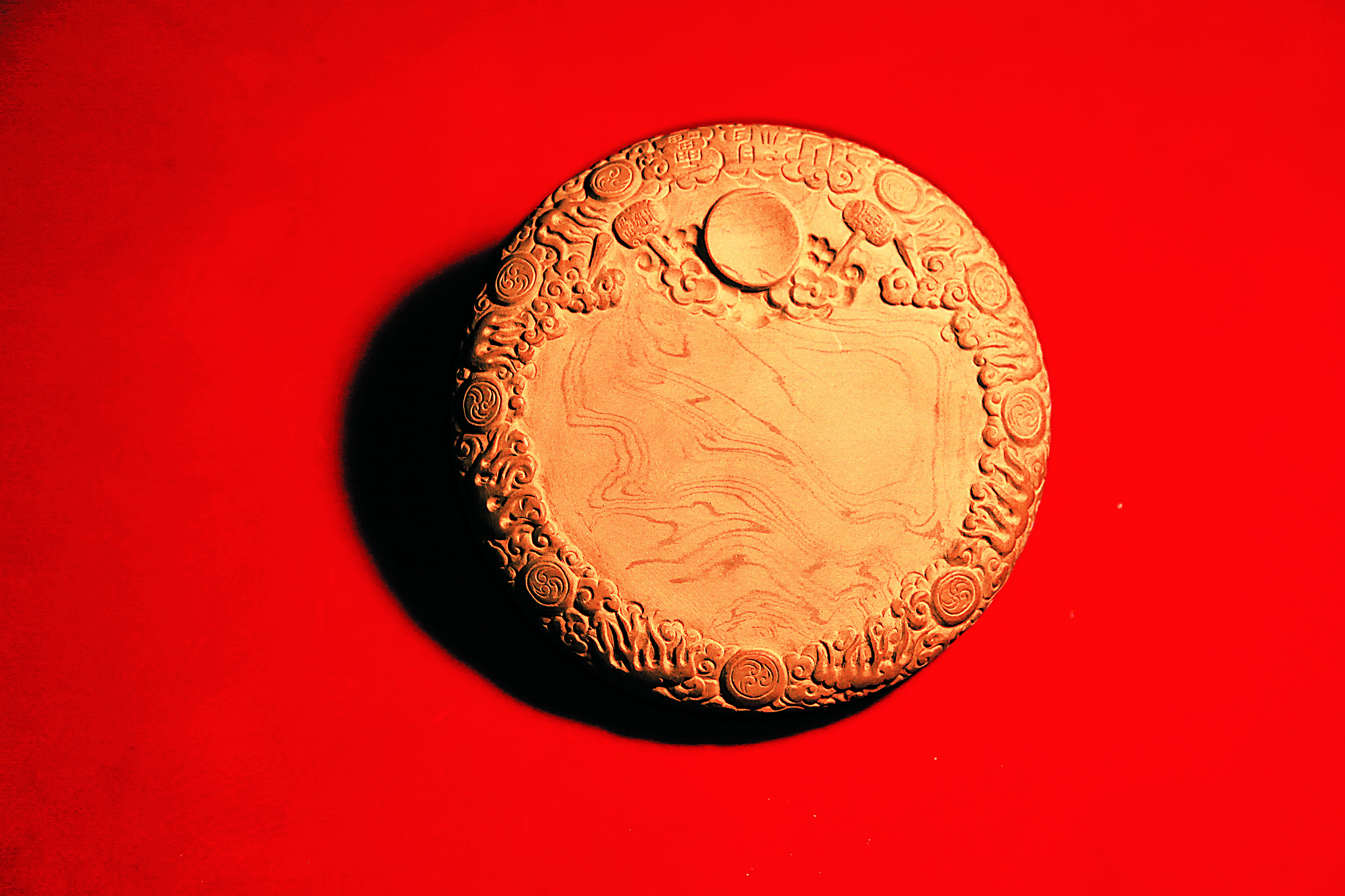 “雷火驱瘟对砚”也是两方,砚呈圆形。“雷神砚”正面遍刻祥云、闪电,砚面刻九颗响雷。以太阳做砚池,用祥云托起,并雕刻一对大锤护于太阳四周,寄寓着全国人民在党中央的英明领导下,一定能战胜疫情的必胜信心。“火神砚”以太阳为砚池,遍刻祥云,寓意中华吉祥平安。砚周遍刻神火,砚背面刻“雷神山医院”“火神山医院”图标,以及马长泰编写、杨淑云撰书、蔺涛雕刻的“雷神一吼疫魔退,世界三呼中国强”“百代人打造五千年屹立铁骨铮铮大国摆开天网阵,总书记把航全民族凝心中华浩浩疫魔定死火神山”两副对联,进一步突出主题。 蔺涛说,“砚为心语”。这两套砚充分表达了绛州澄泥砚研制所的美好祝愿,相信一定能战胜疫情,也以此砚向奋战在抗疫前线的英雄们致敬!向伟大的中国共产党致敬!