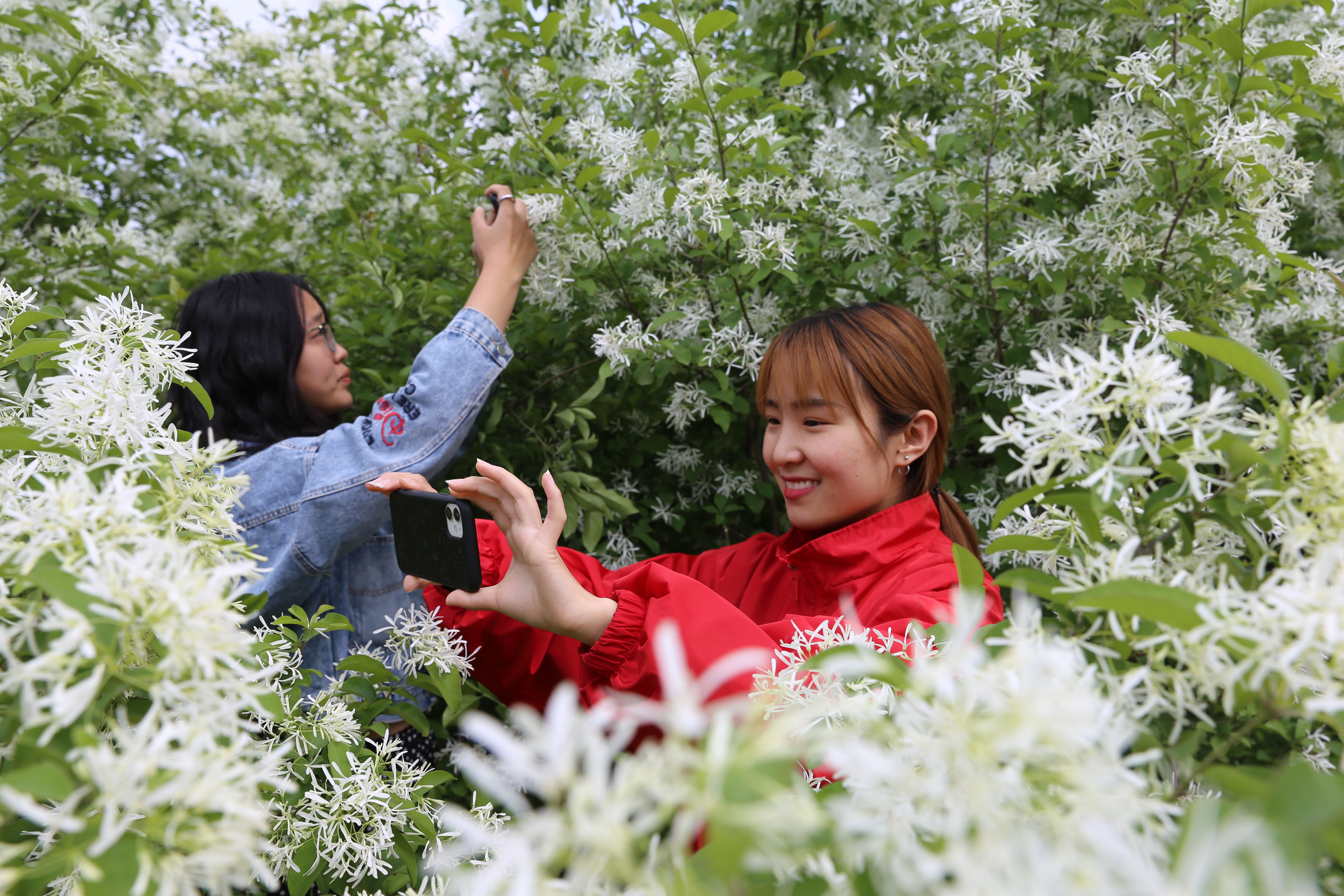 4月19日,游人在夏县一处园林欣赏雪白芳香的流苏花。 这种流苏树原生在我国云贵高原的高寒地带。夏县瑶峰镇石泉沟村村民张永军把这种树引进本地,以它为砧木嫁接桂花树。如今,桂花在我国北方地区成为新风景,而流苏花也成为夏县的新风景。 张秀峰 姚中吉