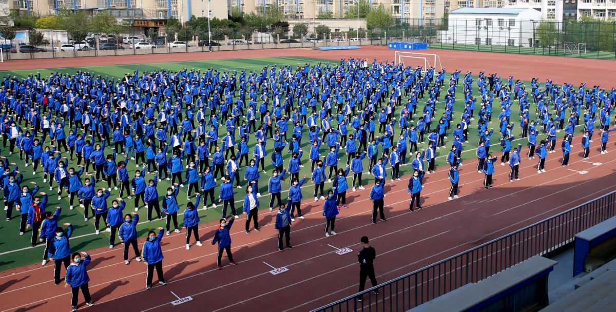 ▲运城中学高三学生在操场练习“八段锦” 杜磊 摄