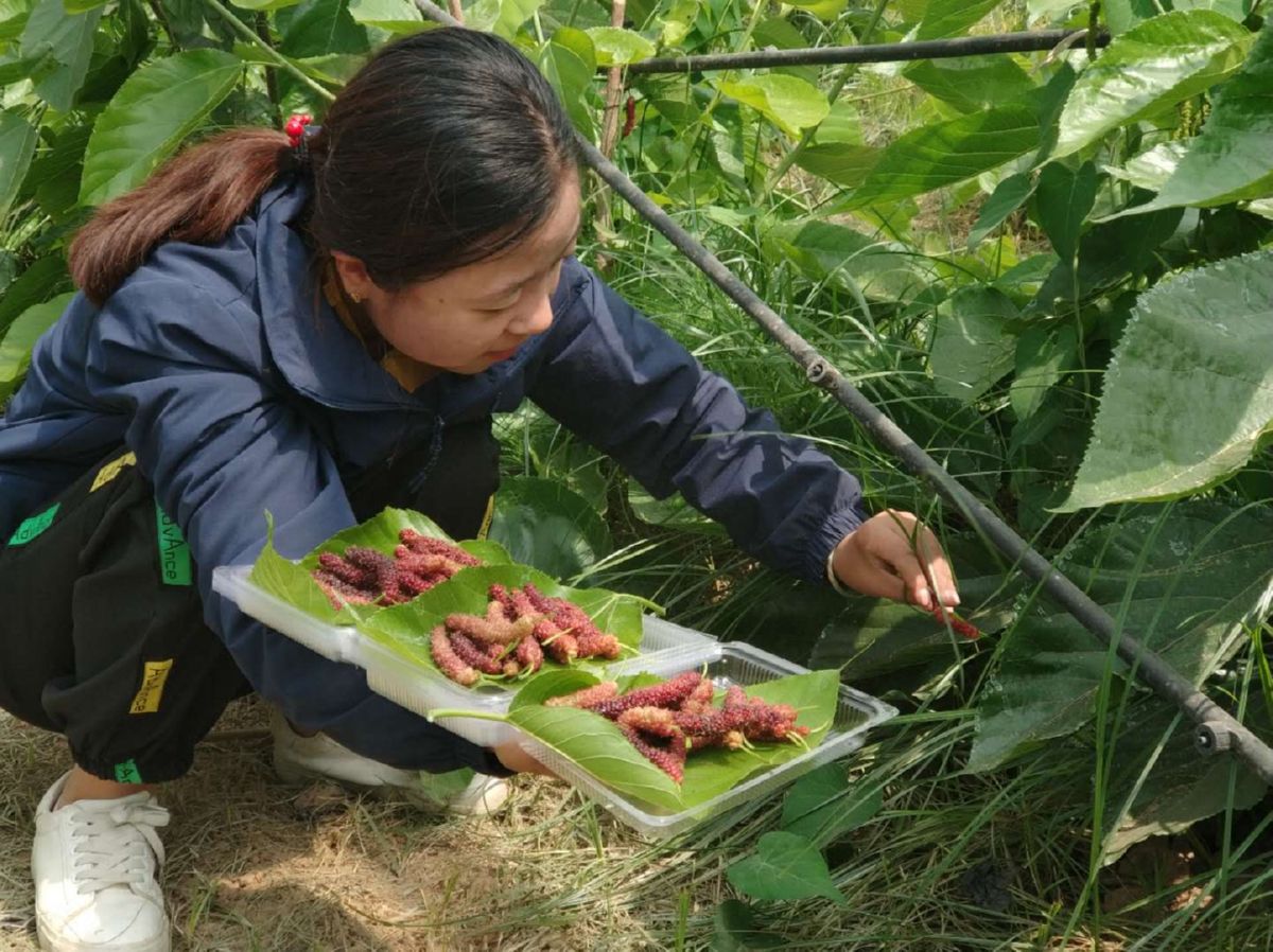 4月20日,在盐湖区西张耿国家现代农业示范园区中农乐基地,工人在采摘长果桑。