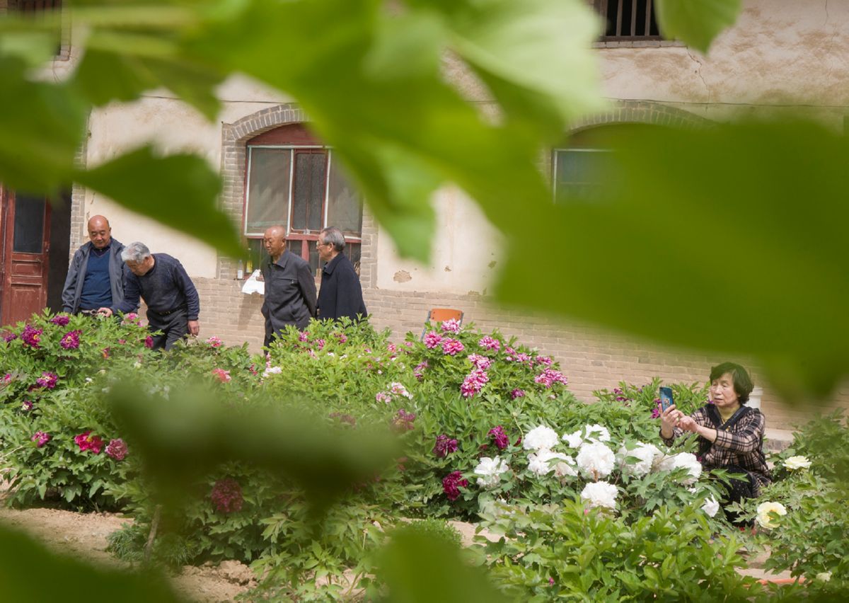 ▲近日,游人在万荣县张户坡村退休干部杨世珍院内的牡丹园赏花、拍照。