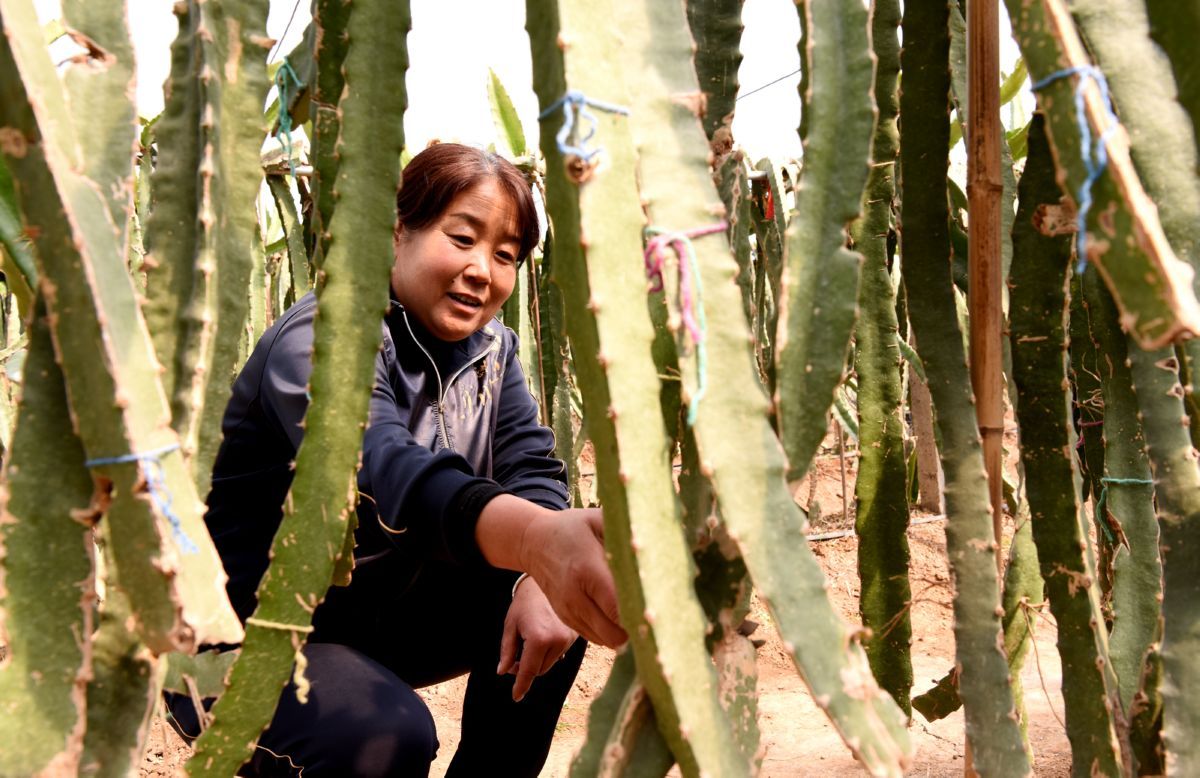 4月17日,在垣曲县左家湾村“众之源”采摘园大棚内,村民黄刘平在管理火龙果。这个采摘园是一个休闲农业扶贫项目,种有草莓、火龙果、无花果等,集农旅融合、乡村振兴于一体,吸引了许多市民观赏休闲。