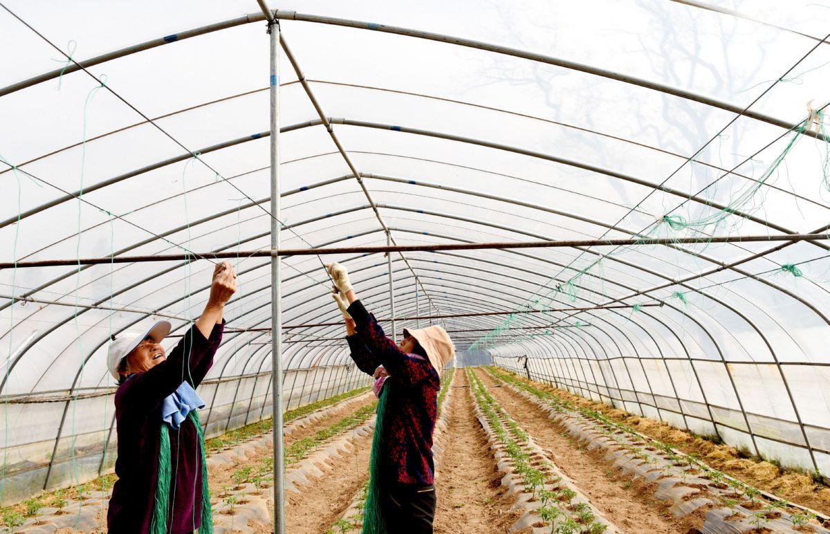 4月18日,在垣曲县槐南白村蔬菜基地,村民在“扶贫大棚”里为西红柿苗绑扎吊绳。