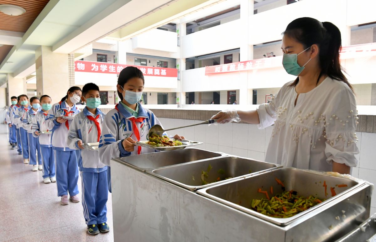 ▲4月27日,陕西师范大学锦园小学的学生在排队领取午餐。