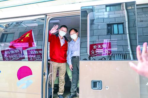 ▶4月27日,北京协和医院感染内科主任李太生(左)和主任医师刘正印向迎接的人们挥手。 随着武汉新冠肺炎重症病例实现清零和在院新冠肺炎患者清零,在国家援鄂抗疫医疗队撤离后仍留守武汉的部分医疗专家,完成任务后,于4月27日撤离武汉返回北京。 新华社记者 张玉薇 摄