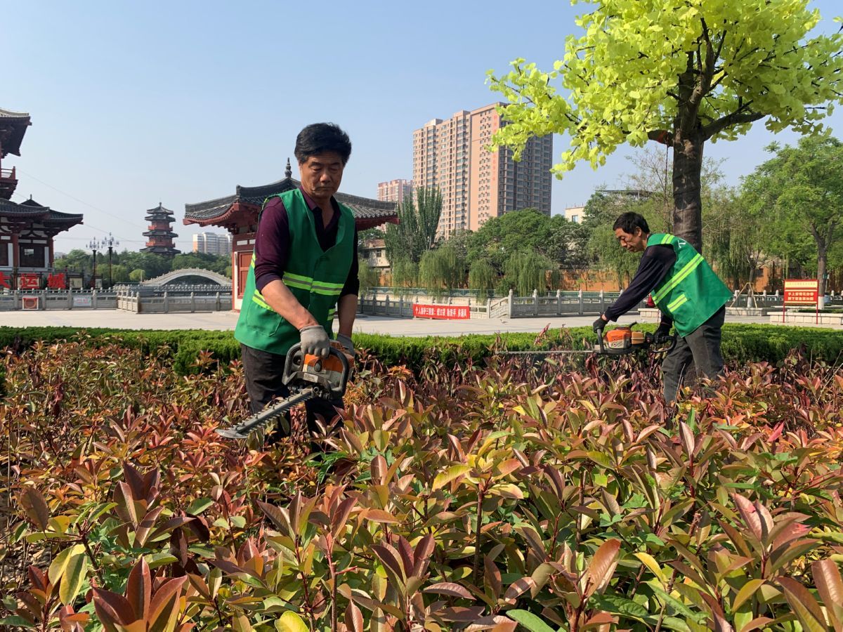 运城晚报讯(记者 廖旌汝)4月27日下午,在市区人民公园,园林工人正在对该园南门入口处的绿植景观进行修剪。