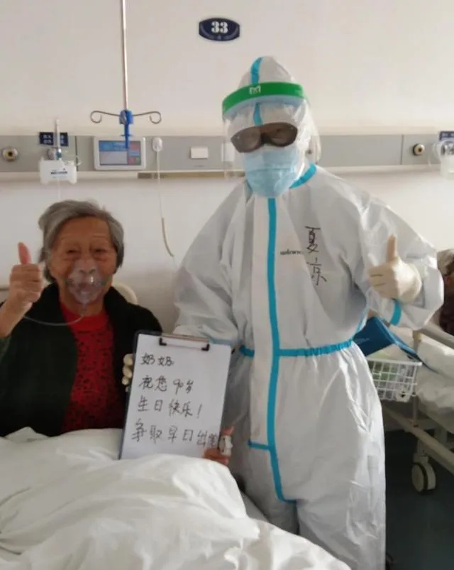 3月18日,武汉大学人民医院东院区新冠肺炎21病区,医务人员为90岁的周太婆祝寿。