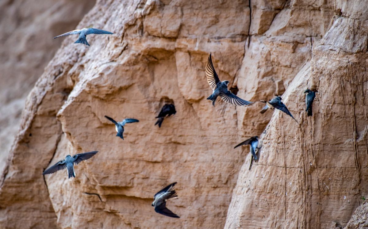 暮春时节,在临猗县角杯乡张郭村外的黄河岸边土崖上,数千只沙燕或求偶、或飞翔、或觅食、或嬉戏,形成了一道亮丽的风景线。 本版摄影 记者 薛俊