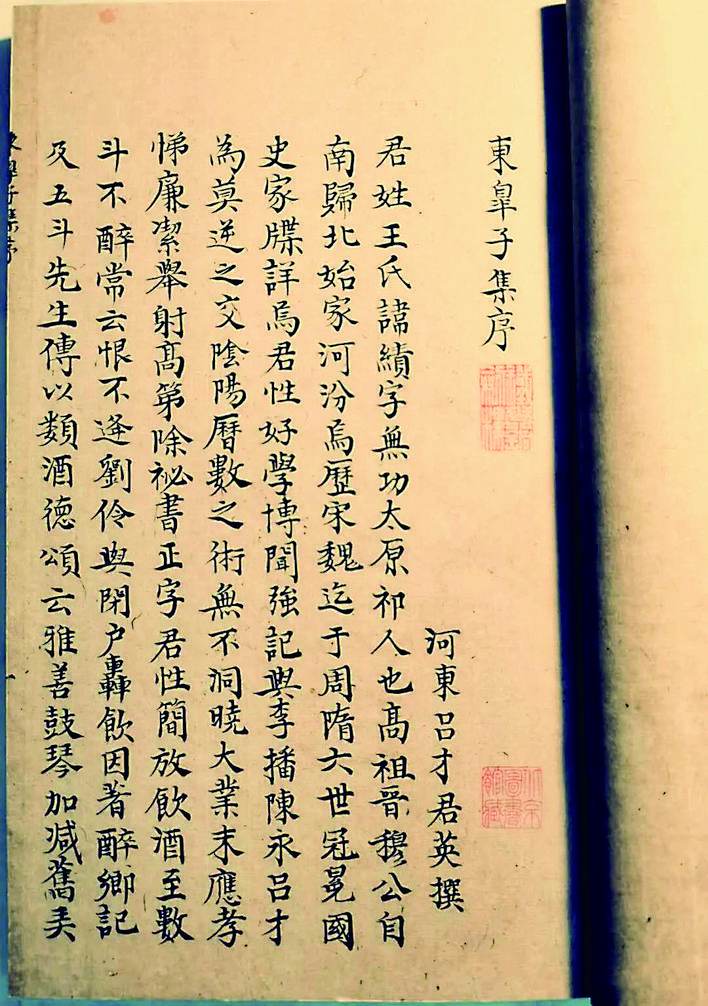 吕才序篇目为“东皋子集序”第一行靠上,篇目下有藏印两枚:一枚为“铁琴铜剑楼”,一枚为“北京图书馆藏”;第二行靠下为“河东吕才君英撰”。序共3页850字。