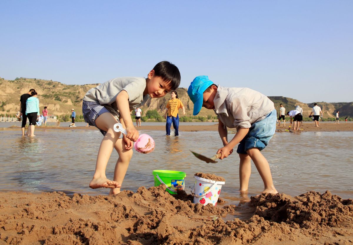 5月1日,两名小朋友在临猗县境内的黄河吴王渡口浅滩区域嬉戏。