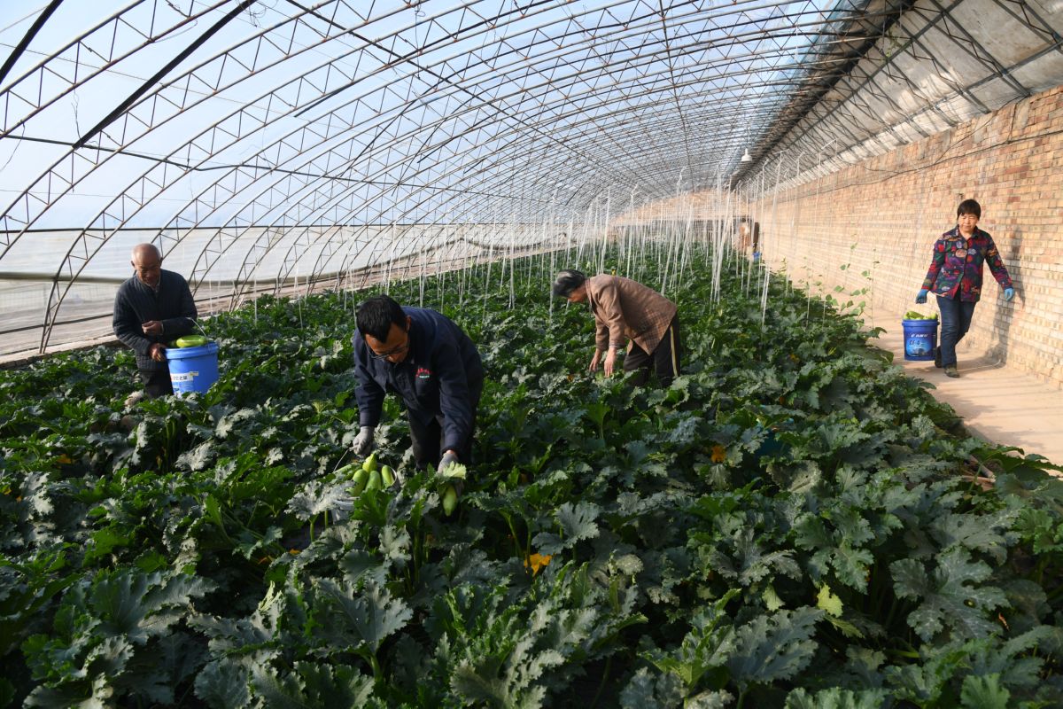 5月5日,闻喜县桐城镇下邱村口福专业合作社社员在采摘西葫芦。