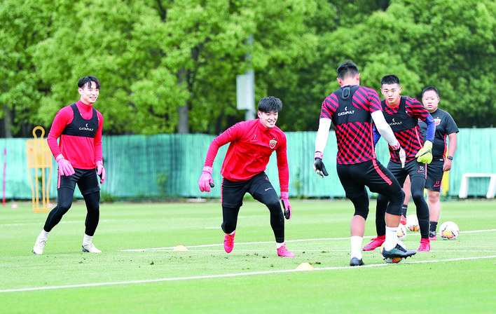 ▶5月7日,上海上港队球员颜骏凌(左二)在训练中。 当日,上海上港队举行媒体开放日活动。目前,球队在做好防控疫情工作的前提下进行正常训练。