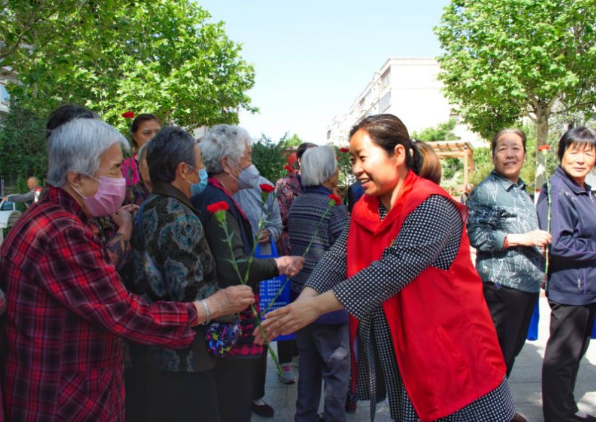 社区工作人员为老人赠送康乃馨 崔萌 摄