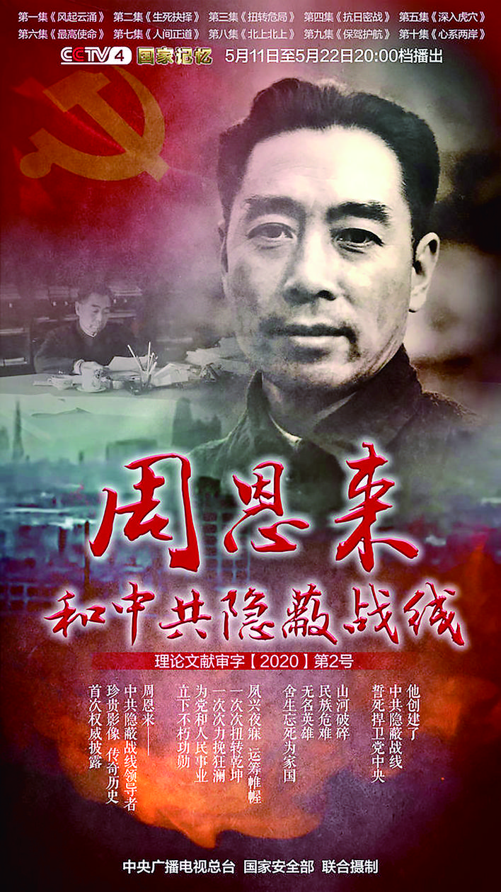 由中央广播电视总台和国家安全部联合摄制的十集纪录片《周恩来和中共隐蔽战线》11日起在CCTV-4《国家记忆》栏目播出。该片通过历史影像、文献资料、专家解读及亲历者后代的口述,首次权威展现周恩来和中共隐蔽战线鲜为人知的历史。