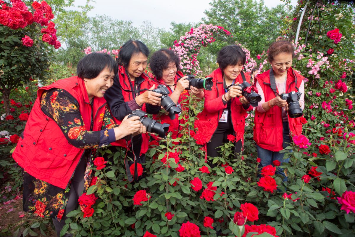 ▲5月9日,在河津市莲池公园,几名摄影爱好者在拍摄盛开的月季花。