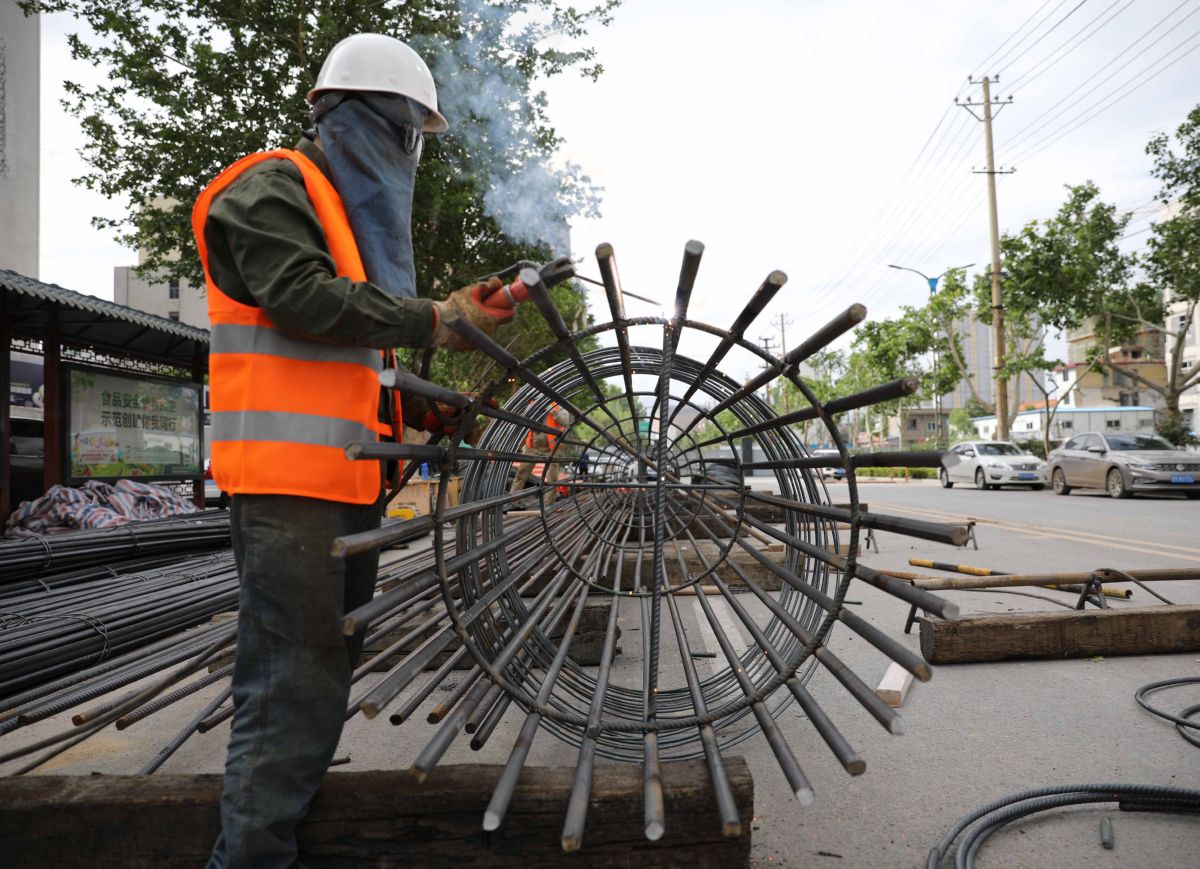 ▲工人在焊接钢筋球笼 祁克宁 摄