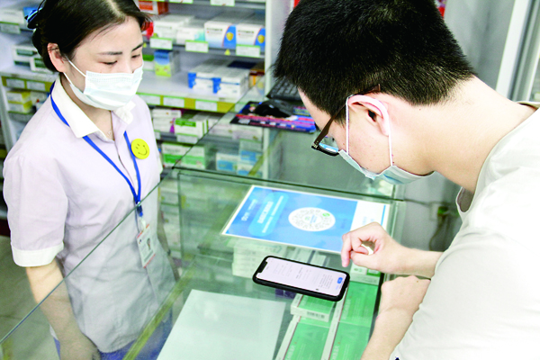 ▲5月14日,一名市民在百汇医药禹西路店利用微信小程序购买处方药