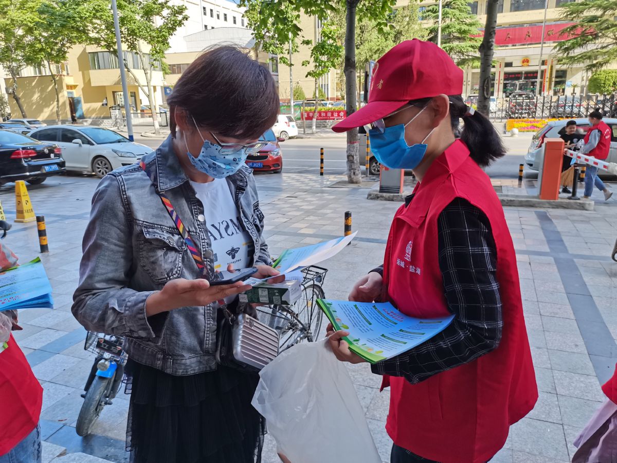 志愿者在发放倡议书 崔萌 摄