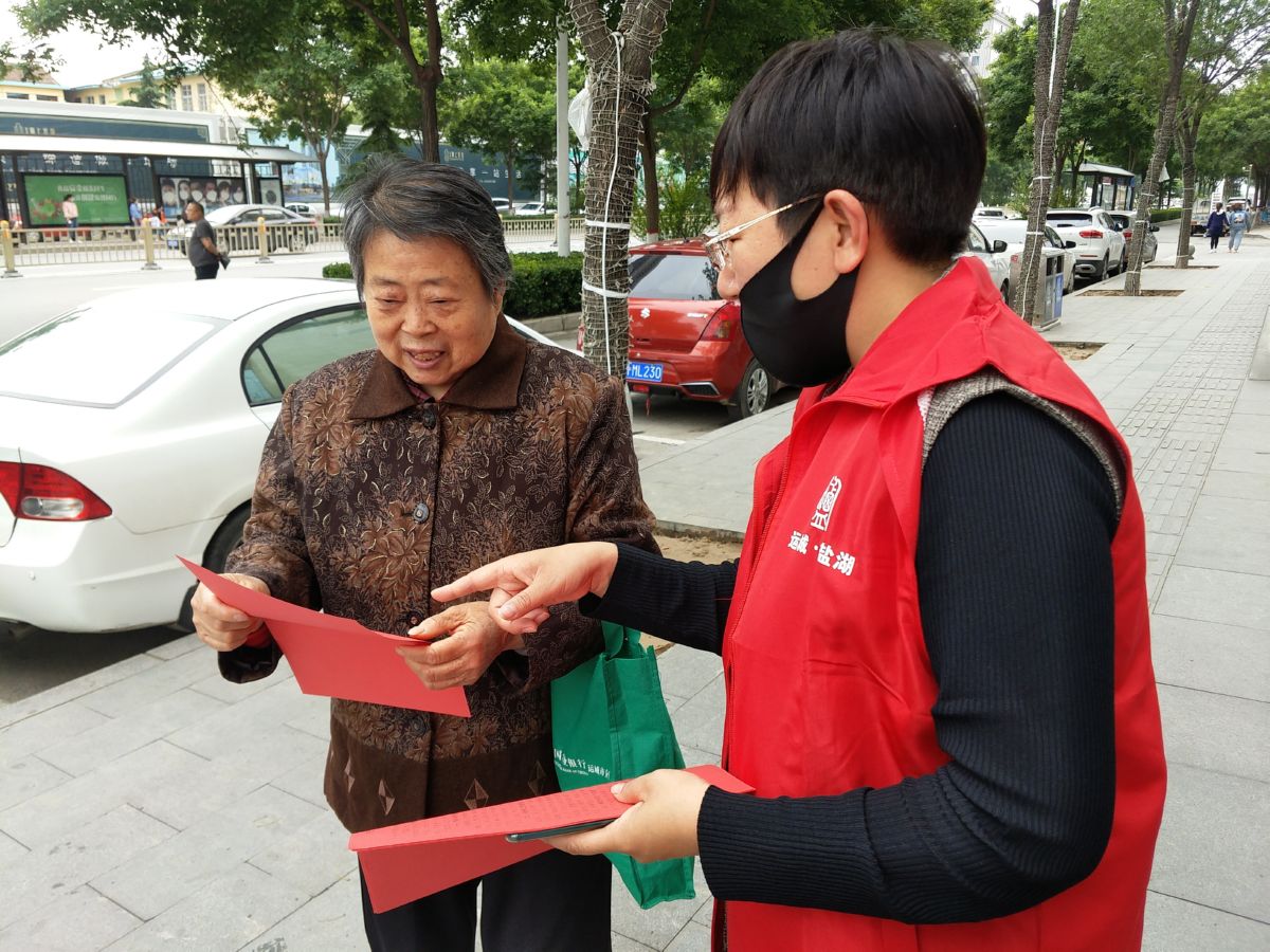 ▲志愿者在向居民讲解倡议书 崔萌 摄