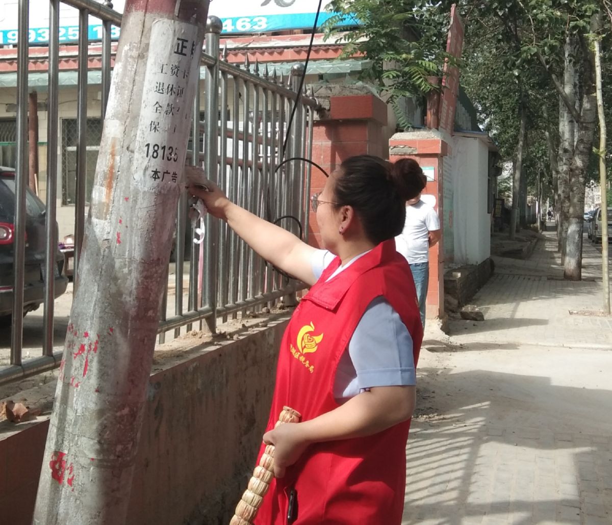 ▲志愿者在清理小广告 崔萌 摄