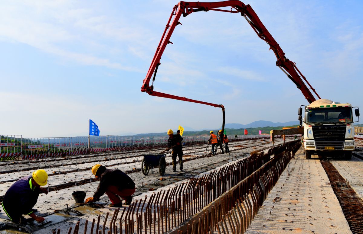 5月19日,垣曲至河南渑池高速公路亳清河大桥施工现场,工人在紧张作业。