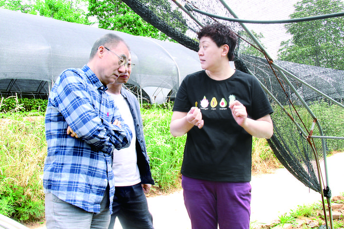 ▲该园总经理陈晓园(右)向著名作家毕星星(左)介绍紫叶茶成长情况 王捷 摄