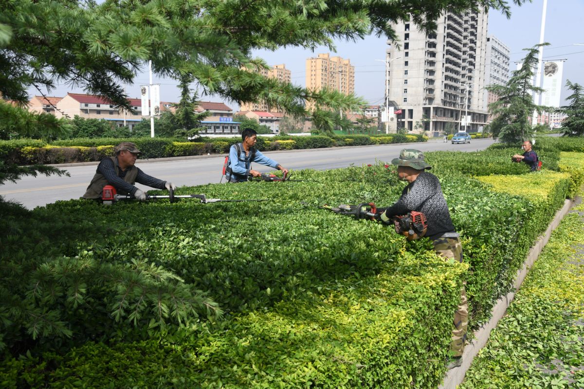 5月21日,闻喜县住建局绿化工人在闻垣路大街两旁修剪绿化带。