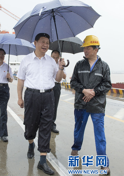 2013年7月,习近平来到武汉考察,一下飞机就冒雨来到武汉新港阳逻集装箱港区。