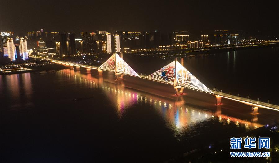 4月8日零时起,武汉市正式解除离汉离鄂通道管控措施,全市景观照明开启(无人机照片)。新华社记者 程敏 摄