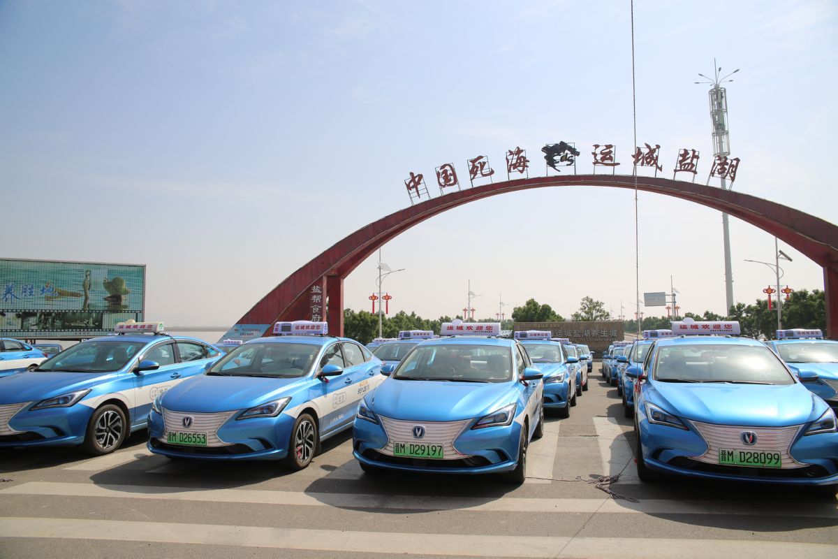 仪式现场,车身蓝白相间的长安新能源出租车,列队停放在运城盐湖景区的彩虹门前,分外引人注目。