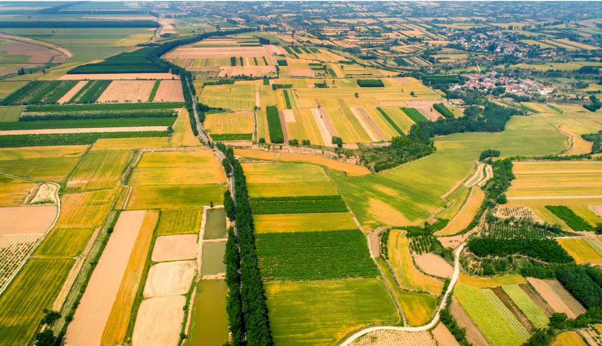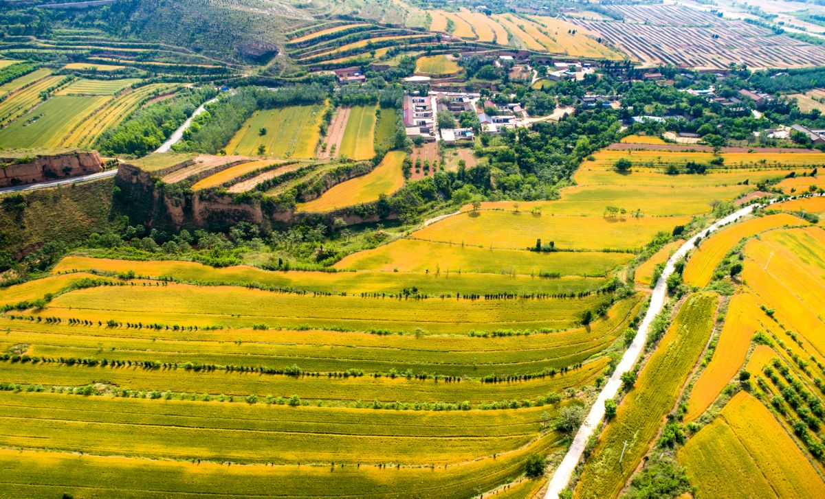 ▲从芮城县东垆乡上空俯瞰,麦田金黄,大地如画。