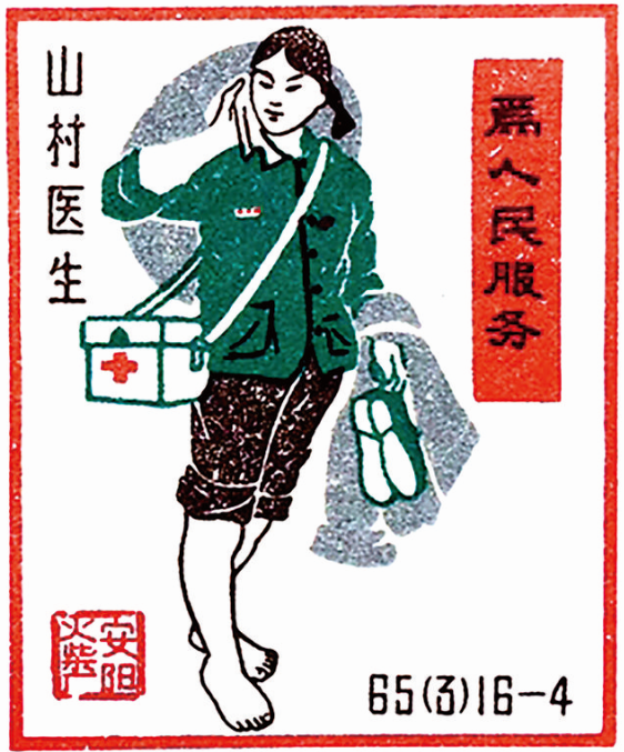 国产火柴企业曾出品过许多以“赤脚医生”为主题的火花。1965年,安阳火柴厂出品了一套16枚“为人民服务”火花,其中“山村医生”就描绘了一名“赤脚医生”的形象:她肩挎药箱,左手提着双鞋,右手拿着毛巾正在擦汗。看她打着赤脚,以及高高挽起的裤腿,似乎刚从田地出来,准备去召唤她的乡民家中瞧病。
