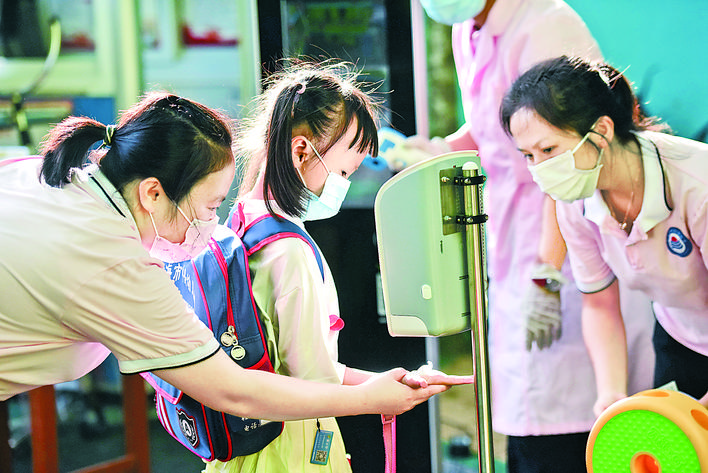 ▶5月25日,海南省琼海市中兴幼儿园的老师在校门前为小朋友洗手消毒。 当日,海南省琼海市幼儿园大班和特殊教育学校开园。 新华社发