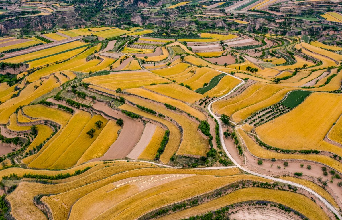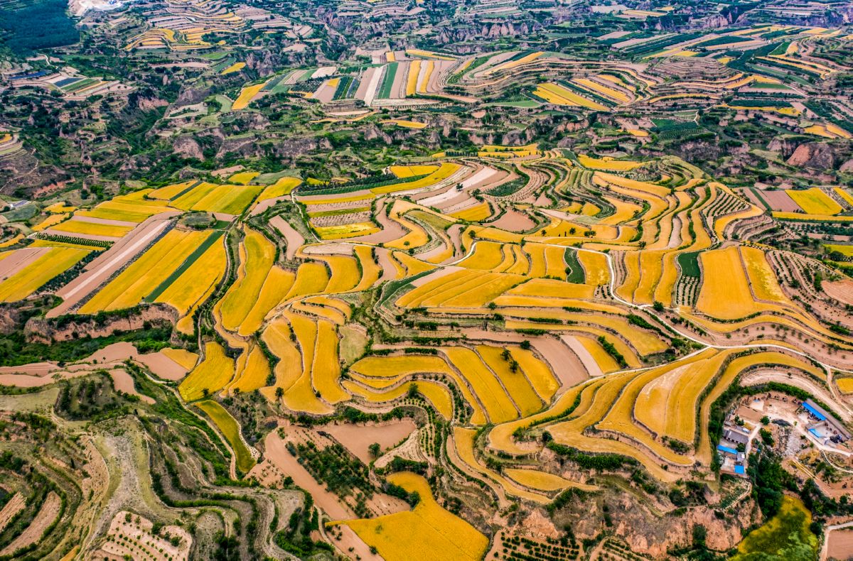 眼下正值小麦收获时节,在万荣县汉薛镇,成熟的小麦分布在层层梯田上,形成了层次分明、纵横交错的美景图,从空中俯瞰,宛如一幅金色的田园画卷,美不胜收。 记者 薛俊 摄