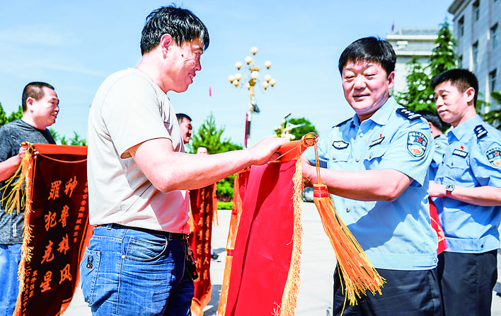 运城晚报讯(记者 樊朋展 李政奇)5月25日上午,芮城县阳城镇20多名群众将一封感谢信和12面锦旗,送到芮城县副县长、县公安局局长李建刚和芮城公安局政委张建林及该局刑警大队、阳城派出所民警的手中,感谢该局破获了发生在阳城镇的系列入室盗窃案件。