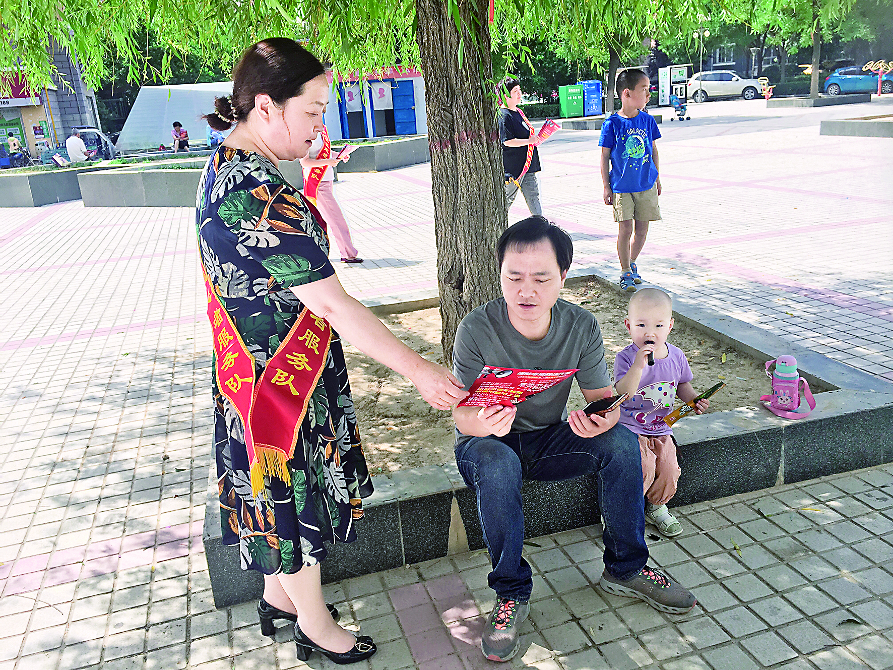 ◀社区志愿者在向居民发放宣传彩页 樊亚楠 摄