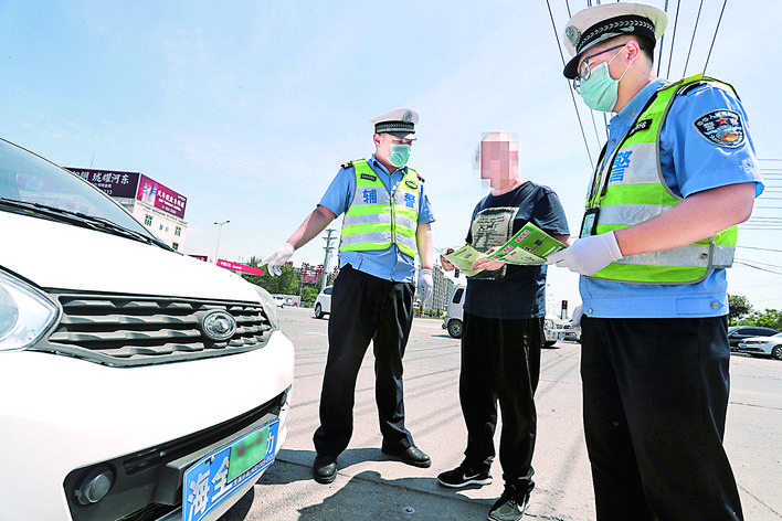 ▶5月26日,盐湖交警大队一中队民警在辖区桃源岗,对四轮电动车驾驶人进行劝导教育。