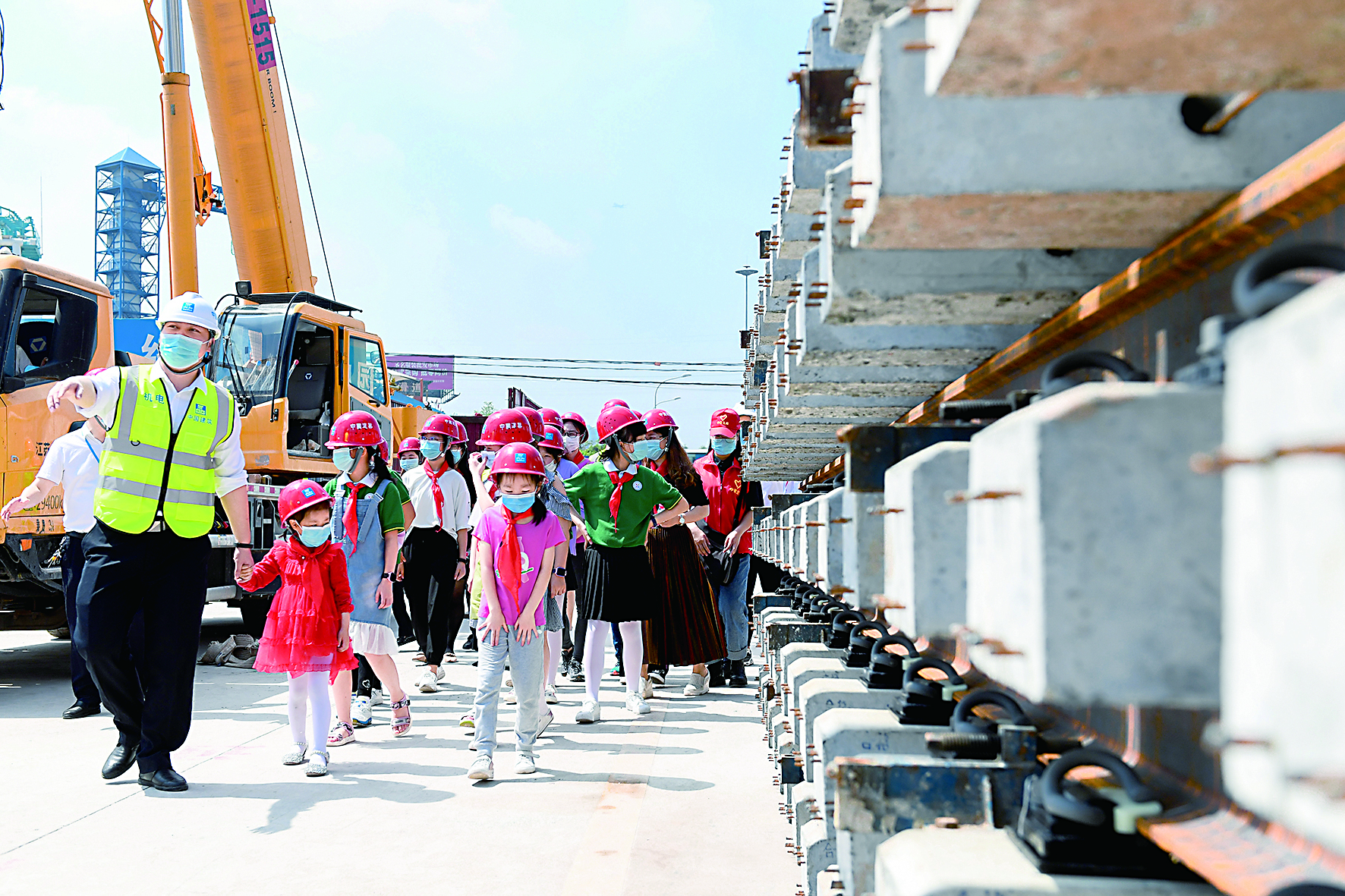 ▶5月29日,孩子们在工作人员带领下参观重庆地铁九号线青冈坪站建设工地并学习安全知识。 当日,中建五局安装公司重庆轨道九号线指挥部迎来一批小客人。地铁建设者子女和重庆市渝北区南方玫瑰城实验小学的学生们在工作人员的带领下一起参观地铁建设工地、做游戏、过集体生日,提前度过一个特殊的儿童节。