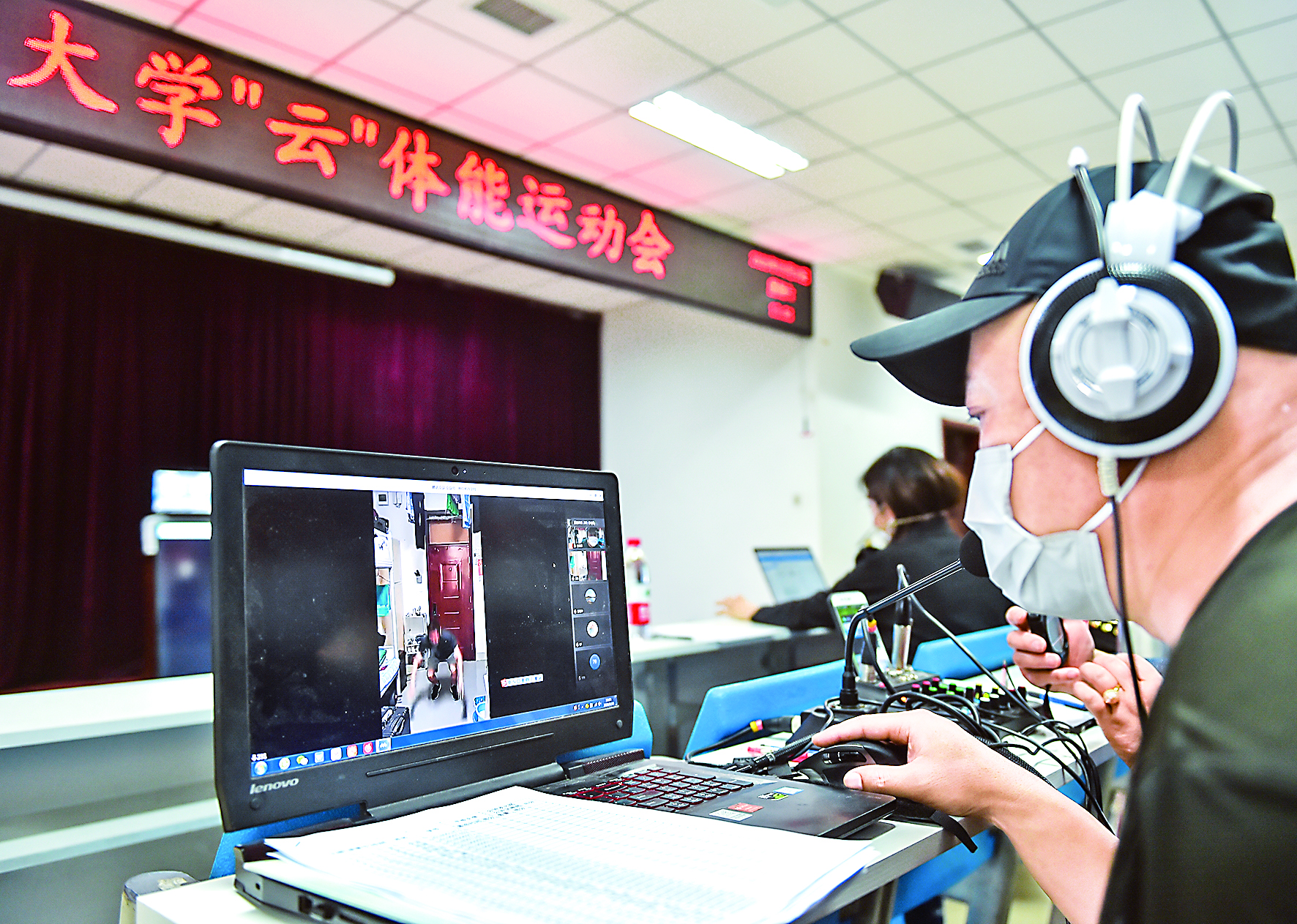▶5月30日,裁判通过网络远程给参加比赛的学生评审打分。 当日,山西省太原理工大学“云”体能运动会决赛开赛。本次“云动会”以网络为平台,设置平板支撑、一分钟波比跳、一分钟深蹲跳等多个比赛项目,学生可自主选择比赛场所,通过全程直播的形式,学生在线直播比赛,裁判远程在线评审打分,“云”上评出名次。 新华社发