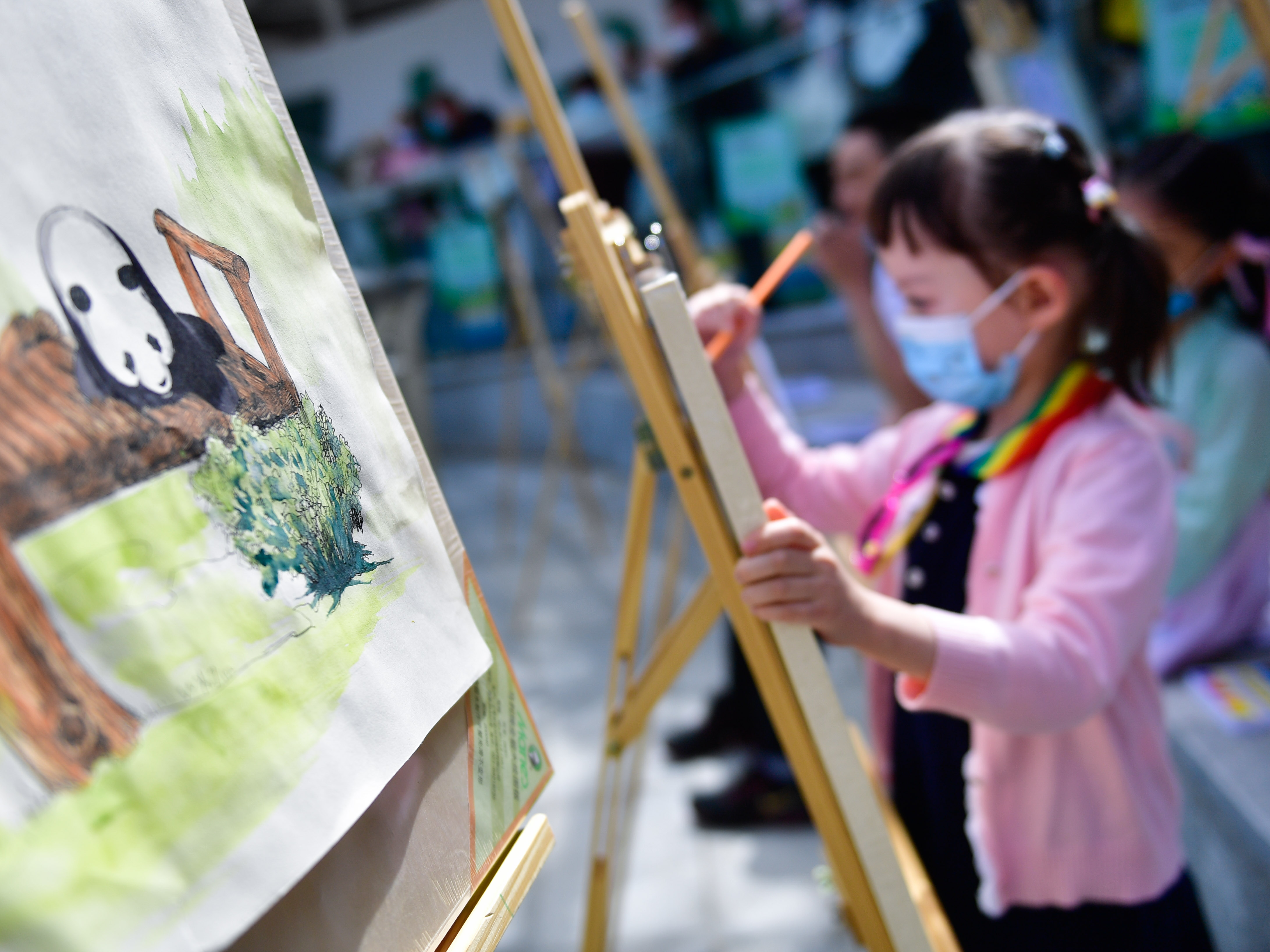 5月31日,小朋友在西宁熊猫馆内绘画。 “六一”国际儿童节来临之际,西宁熊猫馆组织小朋友参观游园、现场绘画、制作熊猫创意产品,同时还给馆里的大熊猫准备了儿童节“大餐”,与小朋友们一起迎接节日。 新华社发