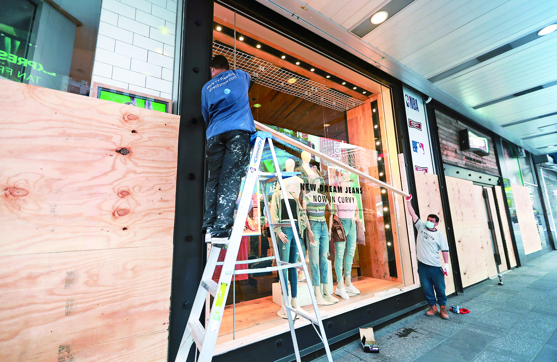 ▶6月1日,工人在美国纽约时报广场为商店加装护板。 美国明尼苏达州白人警察暴力执法导致非洲裔男子乔治·弗洛伊德死亡,由此引发的抗议示威活动连日来在全美持续蔓延,多地发生骚乱和暴力冲突。抗议活动在纽约已经持续五天,当地主要商业区的商户纷纷加装围挡或护板,保障自身安全。