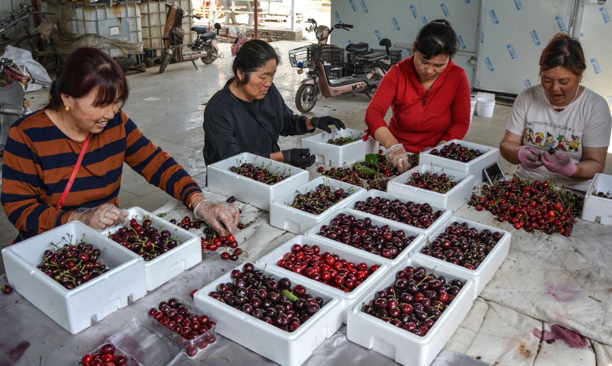 5月31日,临猗县林红果品专业合作社社员在将樱桃装箱,准备发往市场。