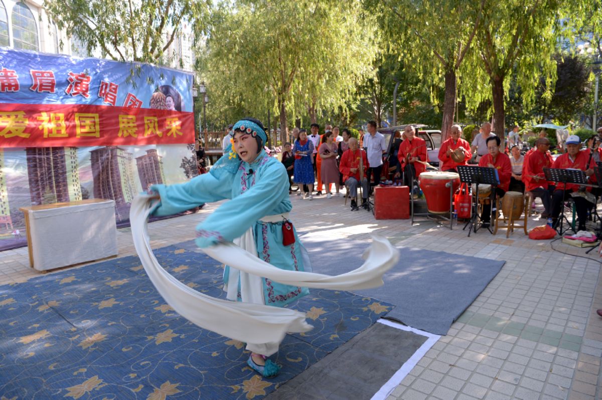 5月29日,运城红星蒲眉演唱团在南风广场组织了一场“爱祖国、展风采”戏剧义演。