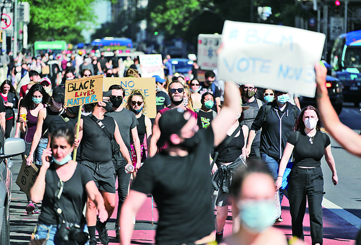 ◀6月3日,人们手举标语牌在美国纽约街头抗议。 当天,由美国明尼苏达州明尼阿波利斯市警察执法失当致非裔男子乔治·弗洛伊德死亡一事引发的抗议活动在纽约进入第七天,大批民众继续在街头抗议。